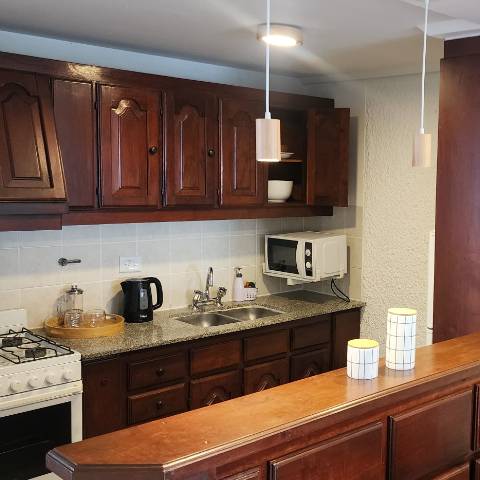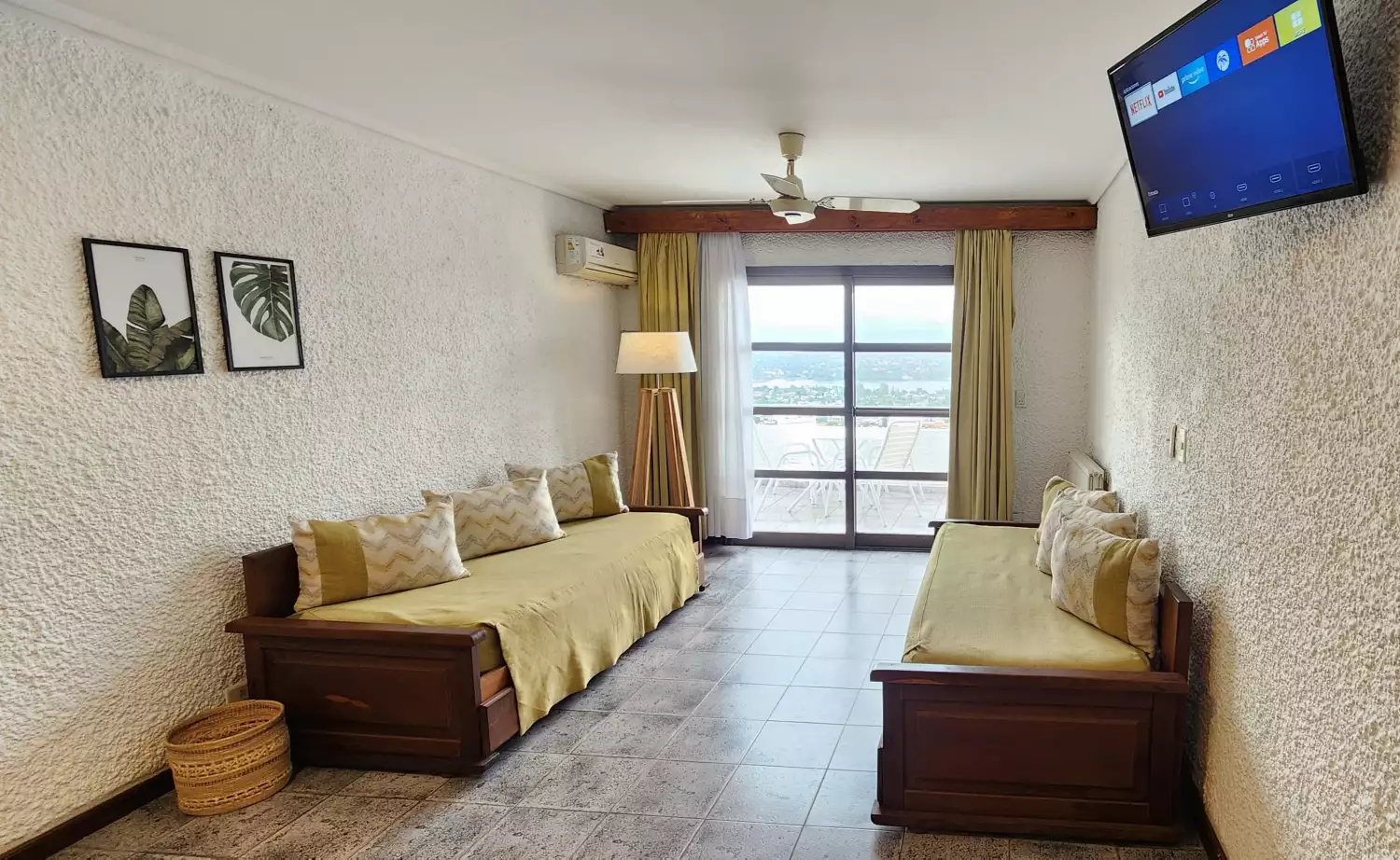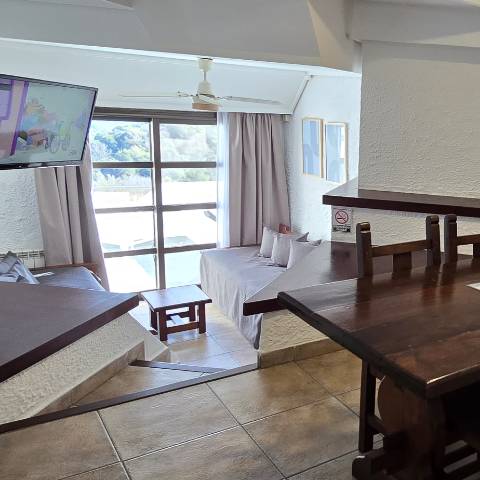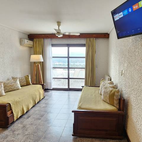 Otro dormitorio para dos personas con cama matrimonial o doble, ventilador de techo calefacción por radiadores, Tv por cable en pantalla LCD y placares con cofre de seguridad. Living comedor con Tv por cable, aire acondicionado, ventilador de techo, calefacción por radiadores, dos sofá camas y una cama carrito debajo de uno de ellos, Cocina totalmente instalada Baño triple zonificado Hermoso balcón panorámico con asador.