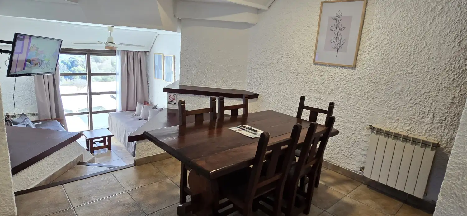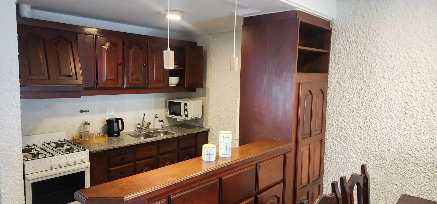 Departamento de tres ambientes con dos dormitorios y dos baños Un dormitorio en suite para dos personas con cama matrimonial o doble, Tv por cable con pantalla LCD, placares con cofre de seguridad, aire acondicionado, ventilador de techo, calefacción por radiadores, (empotrado en un falso placard cuenta con horno microondas, una pequeña heladera del tipo bajo mesada, bacha y vajilla), baño completo con bañera.