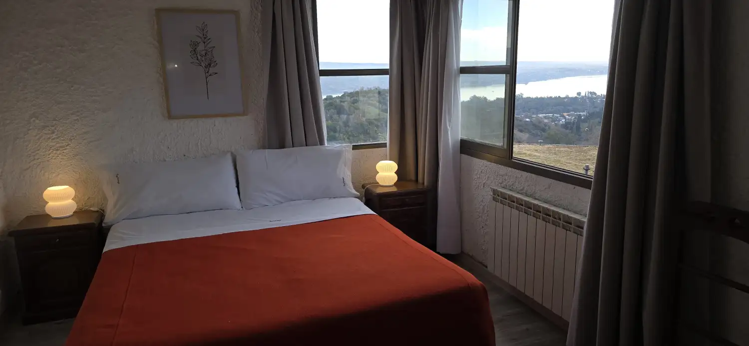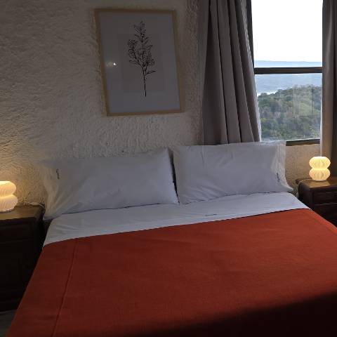 Departamento monoambiente con cocina, con una cama matrimonial, un sofá cama con una cama marinera debajo, ventilador de techo, aire acondicionado, calefacción por radiadores y placares con cofre de seguridad, baño, cocina totalmente instalada, comedor con tv. por cable.